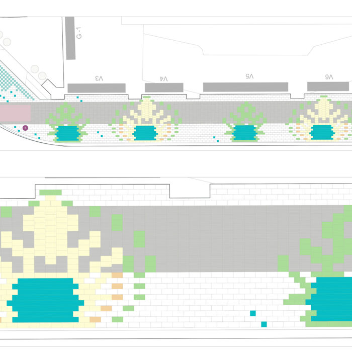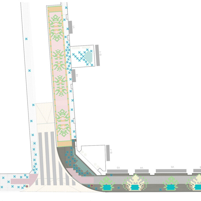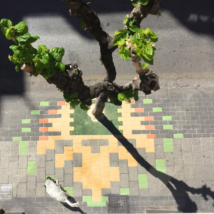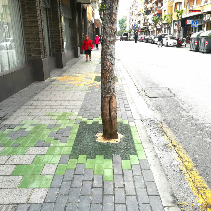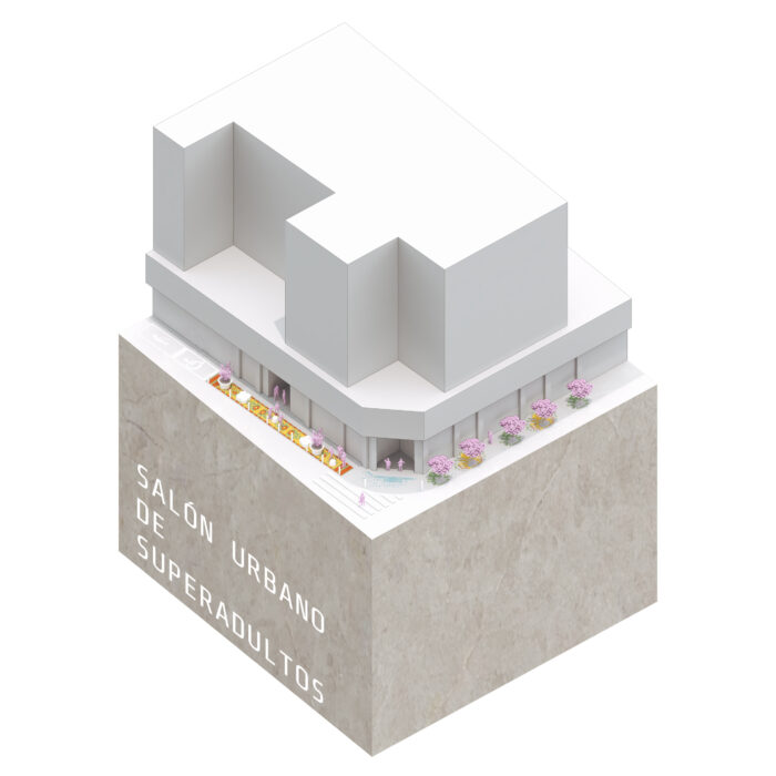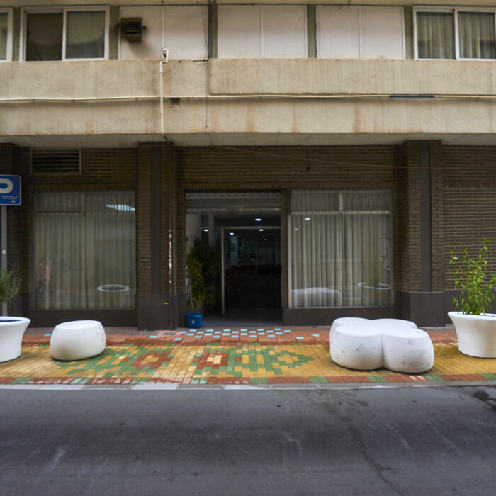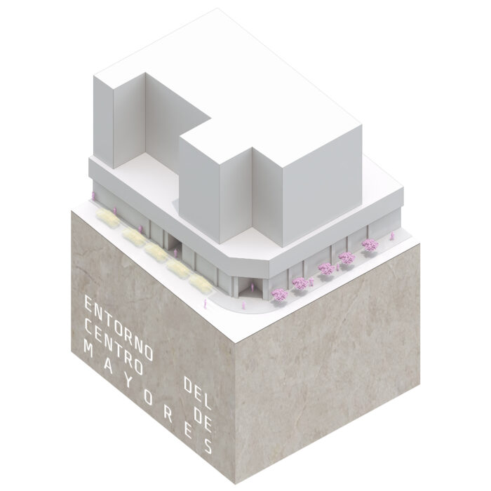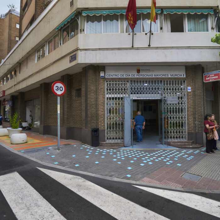 Esta intervención en el Barrio Industrial de ‘El Carmen’ de Murcia, consiste en recuperar la posibilidad de que las personas que usan el ‘Centro de Mayores’ puedan acceder a dicha institución sin tener que sortear los coches aparcados en la entrada. Gracias a esta decisión se consigue un nuevo jardín al aire libre donde los superadultos podrán charlar a la fresca rodeados de maceteros de plantas aromáticas, y que articulará la dimensión afectiva del pasado industrial del Barrio, con el diseño de unas alfombras de adoquines de colores en forma de hojas de morera, árbol simbólico del barrio pues la industria de la hijuela se localizaba antiguamente en él.